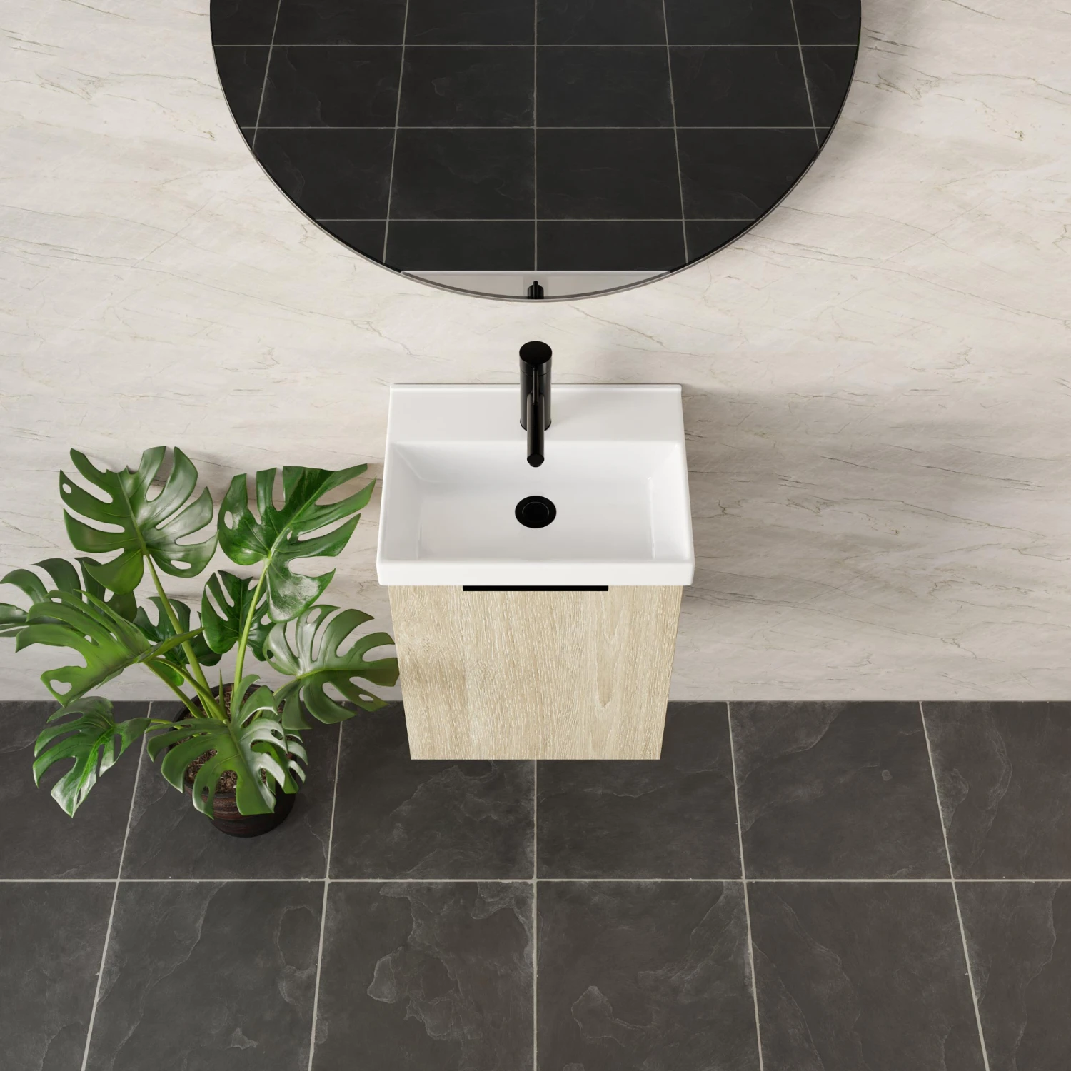 - The Caleta Compact is a wall-mountable vanity that measures 430mm in length, perfect for tight spaces.