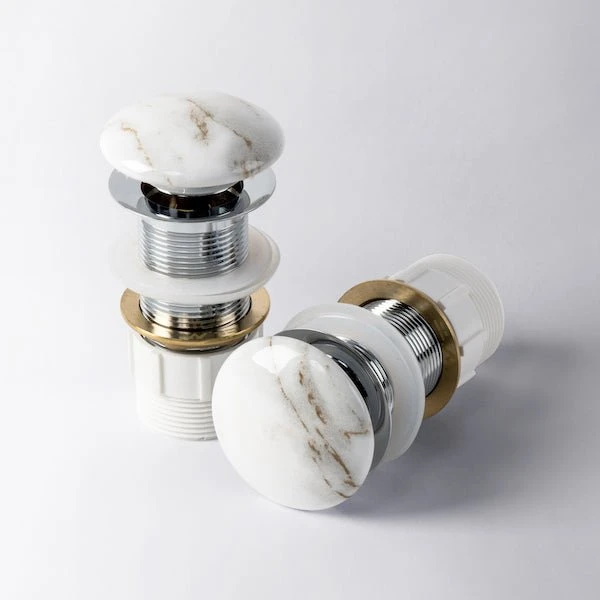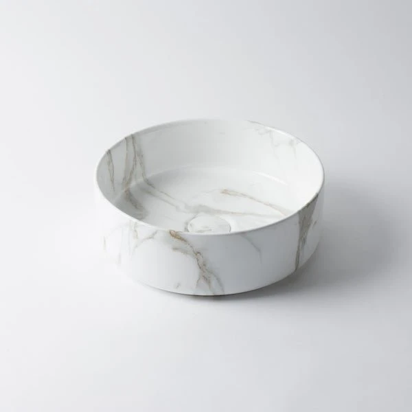 A gloss white ceramic basin with grey and gold marbling in a popular circle design