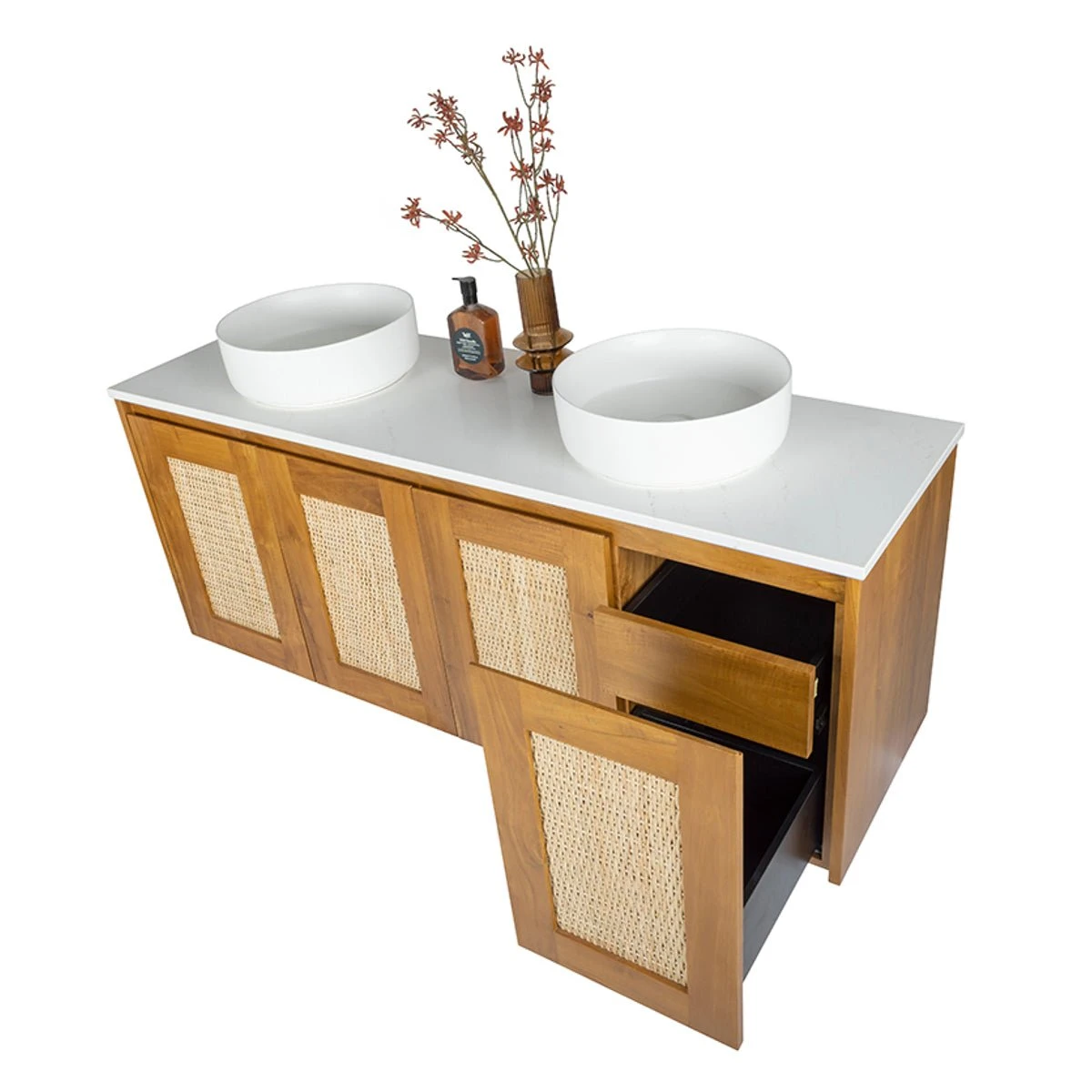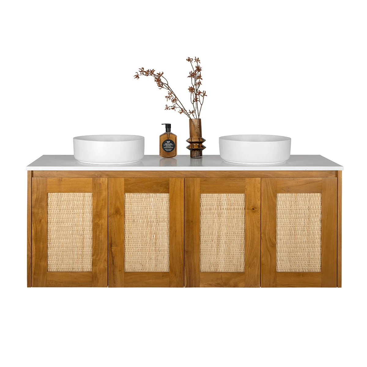 The Santiga also displays a hand-woven rattan face. Our rattan is made in Sri Lankan villages by experienced weavers to ensure all the rattan faces are consistent to each vanity while providing much needed work to support local families.