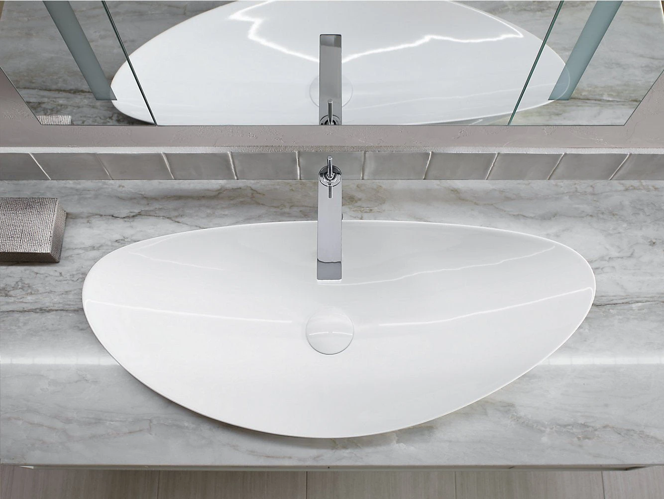 The Veil vessel-mounted bathroom sink features flowing and immaculately balanced curves that evoke a sculpted simplicity in tune with contemporary style. Enhanced by a high-gloss finish, the basin’s sleek, organic shape is easy to clean. At Kohler, we make it our business to help you create the bathroom space of your dreams.