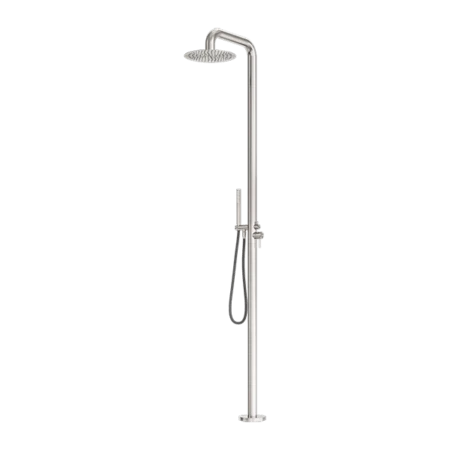 This shower column offers both an overhead shower and a hand shower, providing versatility and convenience for various showering needs. Enjoy a refreshing outdoor shower with the flexibility of multiple water sources.